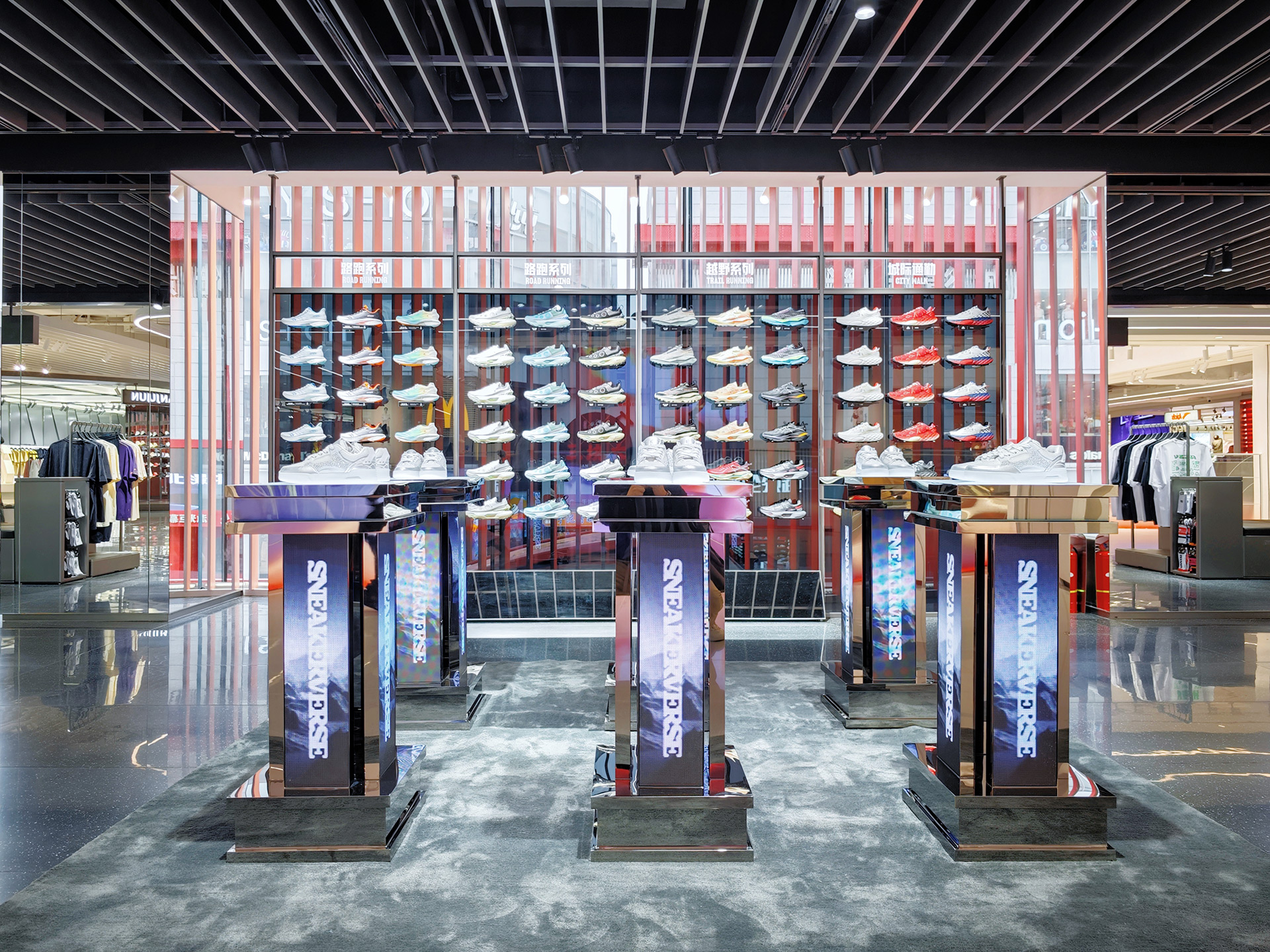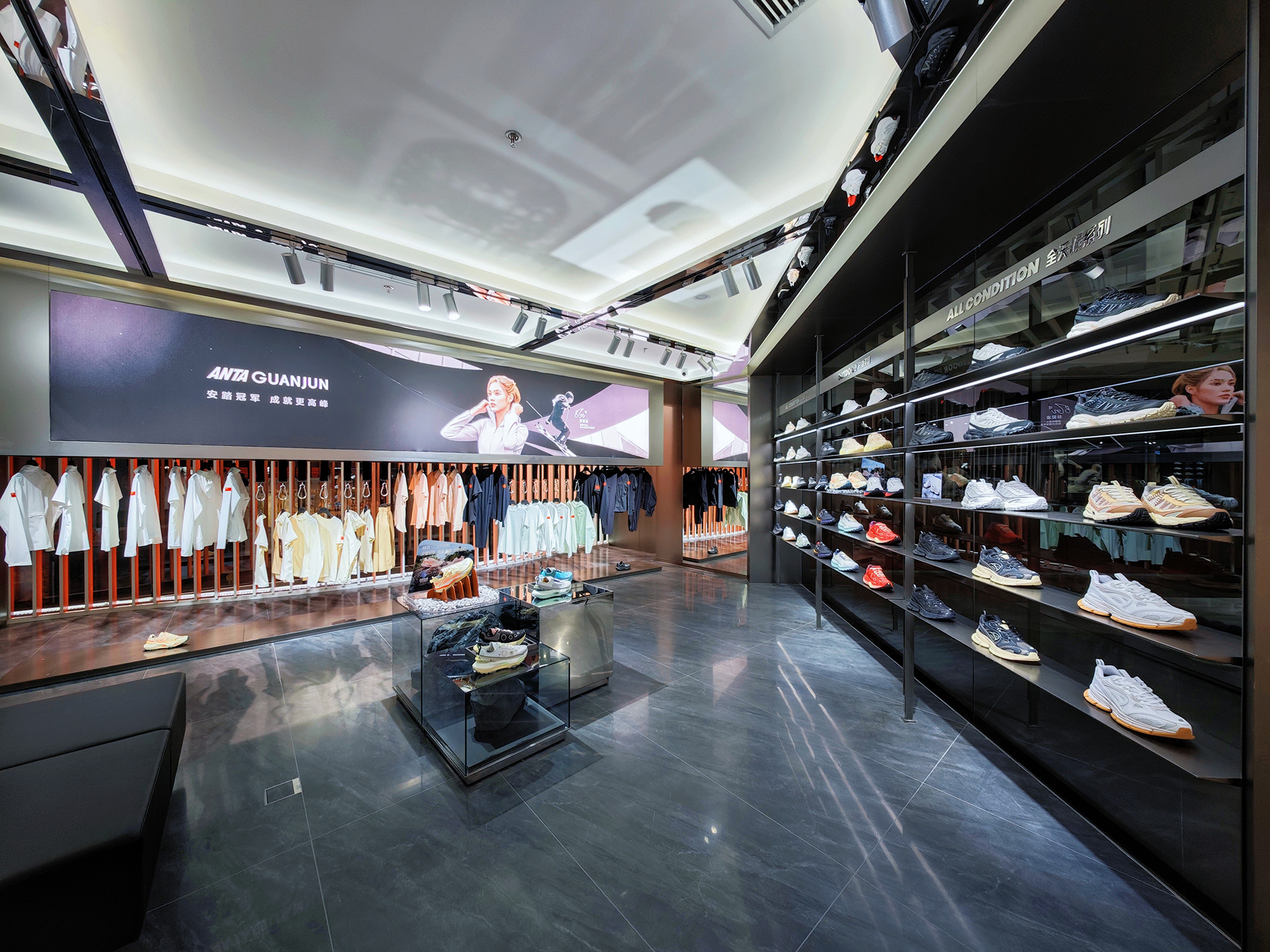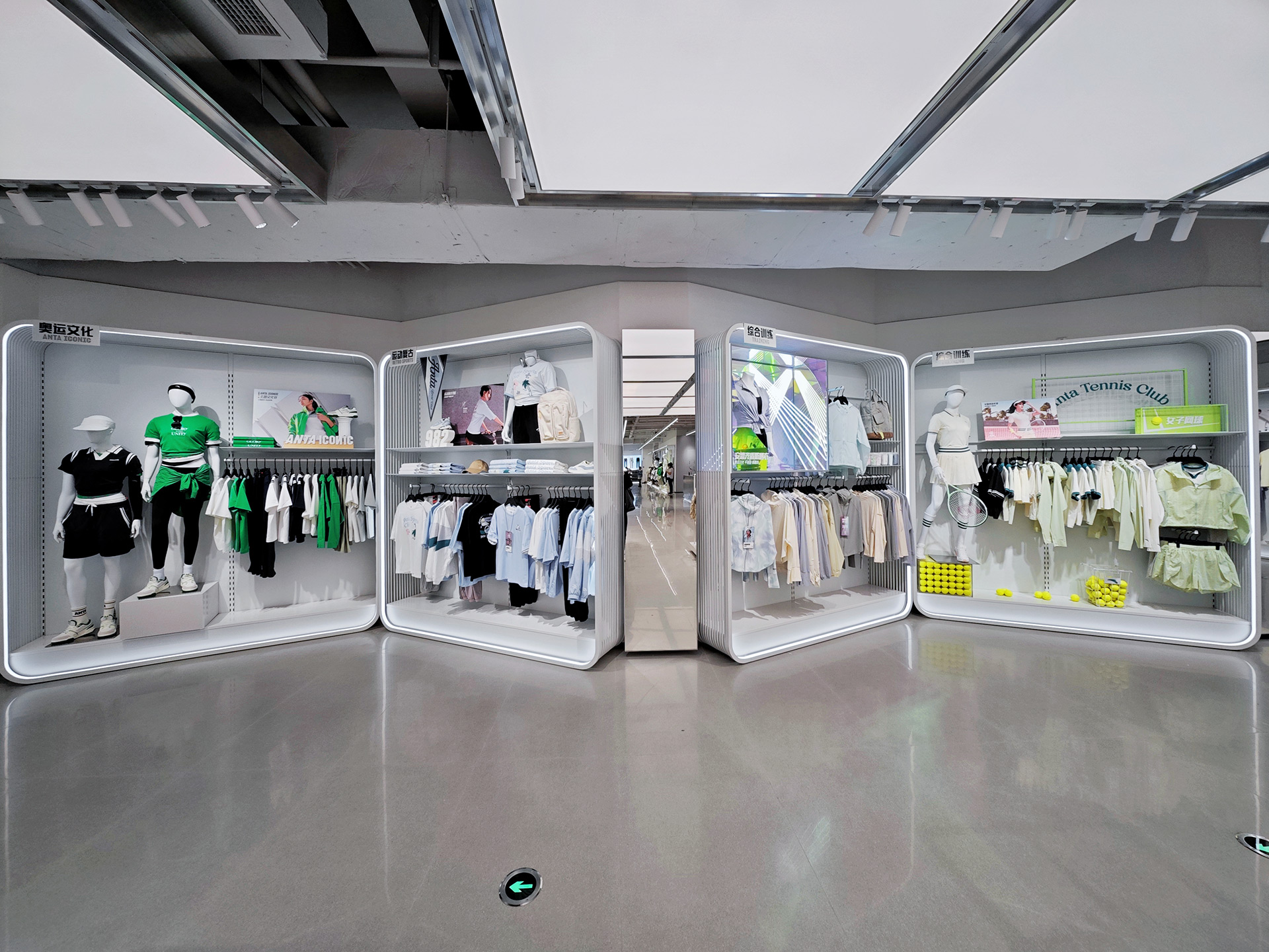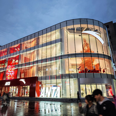ANTA Olympic-Themed Experience Store, spanning over 4,000㎡, marks the brand's first "Arena" store in China, located on Shenyang Zhongjie. Inspired by athletic stadiums and fluttering Olympic flags, the space is designed as a competitive venue immersed in Olympic competition atmosphere.